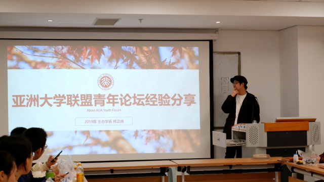 本次交流活动由蒙吉军老师主持。学院拔尖基地强调“深化国际合作,创新学习方式”,特别强调学生要具有国际视野和国际交流能力。本次活动邀请到最近参加了亚洲大学联盟青年论坛的2019级拔尖学生桂正扬同学为大家分享参会的经历、会议活动以及心得体会。