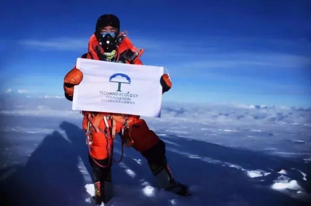▲登山队队长曹峻在卓奥友峰顶手持铁汉生态公益基金会会旗拍照留念