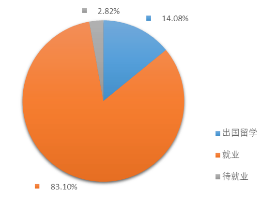 2017年,肉视频 硕士毕业生共71人,其中出国留学10人,所占比例为14.08%,签就业协议59人,所占比例为83.10%,待就业2人,所占比例为2.82%。