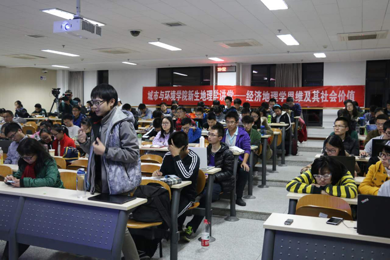 常务副院长贺灿飞教授担任主持人。讲座主题为“经济地理学思维及其社会价值”,刘卫东老师从经济地理学的基本知识、思维模式与典型案例几个方面带同学们领略了经济地理学的广阔视野。 首先,刘卫东老师阐述了经济地理学的含义,它是一门研究地球表层人类经济活动的空间分布及其变化规律的学科。为了使同学们更好理解这一概念,刘老师紧接着抛出几个问题:为什么经济活动在全球分布不均匀?为什么经济活动会随时间的推进在空间上发生转移?我们可以在哪些方面调控经济活动的空间分布?密切联系实际的问题引发了同学们浓厚的兴趣,大家纷纷提出自己的见解和看法。在进行了充分思考与讨论的基础上,刘老师紧接着引用一系列地图与数据,逐渐引导同学们更深入地领会经济地理学的要义。 紧接着,刘老师强调了经济地理学的学科定位。他指出,经济地理学与经济学的不同,在于后者研究虚拟而前者研究真实的世界。因此经济地理学要求研究者具有整体视角与立体思维,从不同的空间尺度分析问题,建立更独特的立体思维模式。也正是因为这样,经济地理学最能培养“系统工程师”与领袖人物。 随后,刘卫东老师列举了“西部大开发战略”、“主体功能区划”、“中三角城市圈”等多个经典案例,让同学们明白了经济地理学在区域发展规划与国家重大方针制定上举足轻重的作用。当谈到“一带一路”战略时,作为设计者之一的刘老师更是强调了它“颠覆世界经济格局”的重要意义。认识到刘老师为国家战略的制定做出的巨大贡献后,同学们不约而同地以掌声表示了由衷的钦佩与敬意。 讲座后的提问环节中,同学们积极踊跃地发言,刘卫东老师耐心解答,侃侃而谈,现场不时响起热烈的掌声。 这次由刘卫东老师带来的精彩讲座让同学们初步了解了经济地理学及其思维模式,亦对同学们认识世界、思考未来方向有着重要的意义。刘老师的号召也使得同学们更加重视立体思维和全球视野的培养,努力奋斗,立志成为时代的领袖。