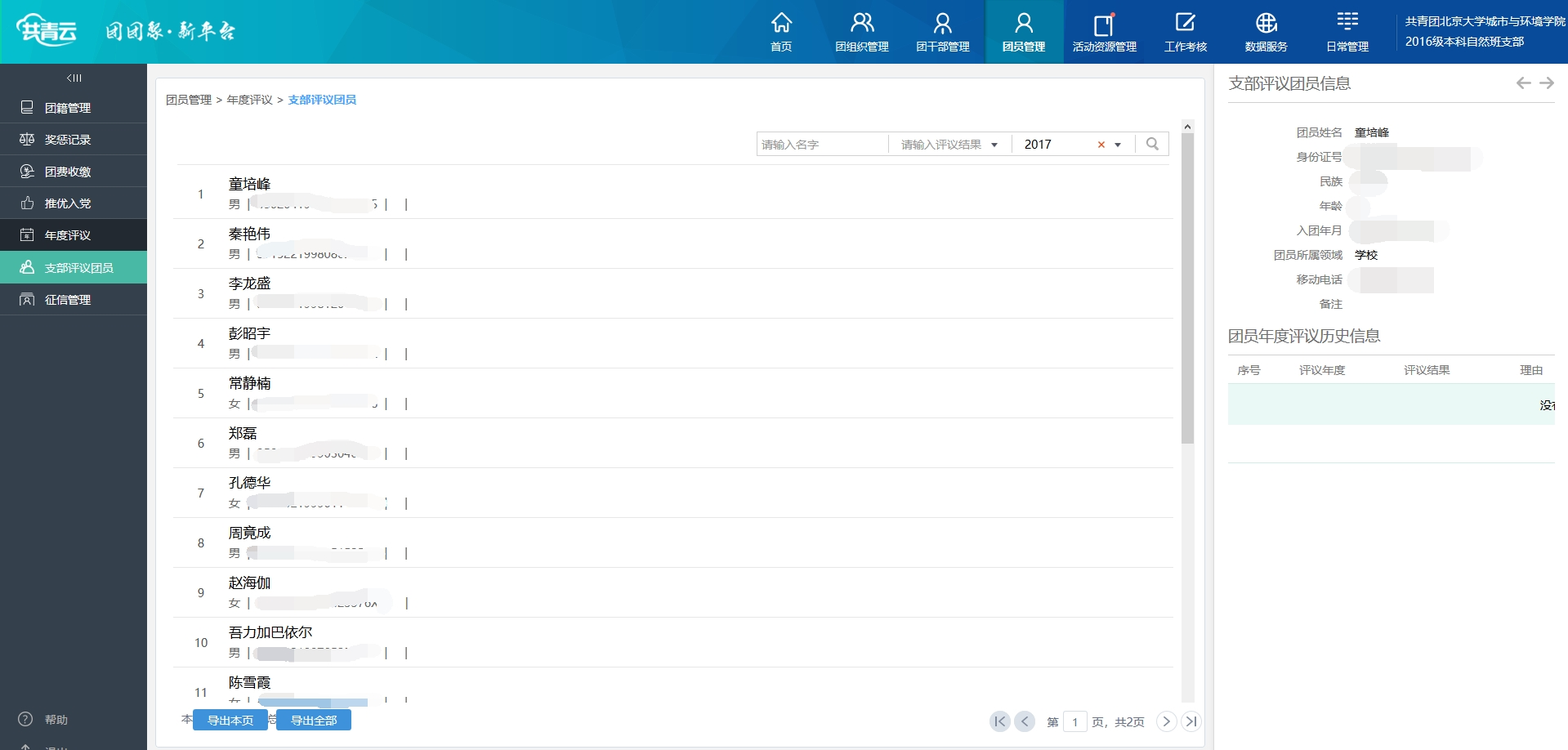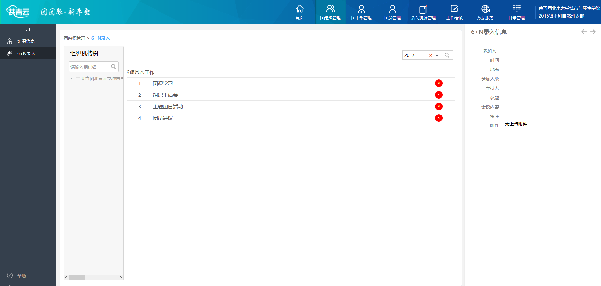 2015级本科环科班团支部”样式填写; 报告表控制在正反面一张纸,建议将“集中学习情况”、“支部大会情况”写满第一页,“评议结果”、“上级委员会意见”写在第二页。 (2)“共青云”系统填写“组织生活会”情况 在TZB开头的团支部账号内进行操作,在本支部界面点击“6+N录入”,点击“组织生活会”进入录入界面,将各班级(团支部)本学期开展的活动详细信息逐条录入,注意上传活动照片。 (3)组织团支部团员教育评议 支部委员会根据评议情况,研究提出每名团员的建议评议等次,报上级委员会批准。团员评议分“优秀”、“合格”、“基本合格”、“不合格”四个等次,优秀等次团员数量应控制在参加评议团员人数的30%以内。评议结果需a.记入《XX团支部-“践行新思想 拥抱新时代”组织生活会报告表》b.录入“共青云”系统。 3、提交要求 12月21日(周四)12:00前:a.将《XX团支部-“践行新思想 拥抱新时代组织生活会报告表》发送至[email protected];b.纸质版正反面一页纸打印,支部书记签字后交到学院团委办公室(英杰交流中心349s);c.在“共青云系统中完成“组织生活会”和“支部团员评议”结果录入。 附件: