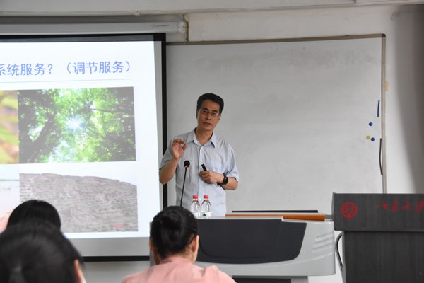 ,讲授了“生态产品价值实现的基本路径与对策建议”专题课程,并从重大意义、概念内涵、经验启示、认识误区和对策建议五个方面进行具体展开,并提出了基于生态产品的经验启示,包括充分依托生态资源、找准自身特点定位、借助市场化的生态补偿机制等。课后,在座师生就生态产品与生态系统服务不同情景下表述等问题与张林波研究员进行了探讨交流。 张林波研究员授课 彭建:生态安全格局 自然地理与自然资源系彭建副教授以“生态安全格局:耦合生态系统服务与景观格局”为学员们带来了一堂理论与实践并重的课程。彭老师从当前资源短缺、环境污染、城市蔓延等一系列威胁区域可持续发展的生态安全问题出发,讲述耦合生态系统服务与景观格局的生态安全格局构建,是实现国家生态文明建设的有效途径。彭老师通过理论梳理与区域案例研究,向学员展示了生态安全格局构建的前沿方法,并提出研究展望,课后学员们对此极大的兴趣,纷纷与彭老师进行交流。 彭建副教授授课 结业仪式 为了使学员们学有所得,本次暑期学校制定了相应的考核规则,为达到考核标准的学员统一颁发由肉视频