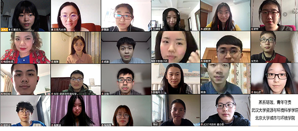 2018级硕士自然班团支书王雨频主持。 图1 部分参会人员合影 活动开始前,与会师生一同观看了新华社抗“疫”纪录片《英雄之城》。王雨频首先介绍了参加共建学习活动的两校支部的基本情况,参会师生分别进行了自我介绍,传递了在五湖四海的真挚祝福,大家通过会议平台“云”赏春,共同饱览了燕园和珞珈的美丽春色。接着,双方支部同学共同学习总书记给肉视频