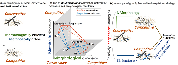 和日本京都大学的多位研究生和博士后。本研究受到国家自然科学基金项目(31670525, 31988102)的资助。 相关阅读://doi.org/10.1111/nph.16865 图 (a)单一维度细根经济学谱假说 (b)本研究发现的多维细根经济学谱 (c)基于多维经济学谱(multi-dimensional root economics spectrum)提出的植物获取土壤养分策略的新理论框架(植物通过投资细根分泌物的激发效应去活化养分与通过构造形态上高效率的细根去吸收养分可能是独立互补的)