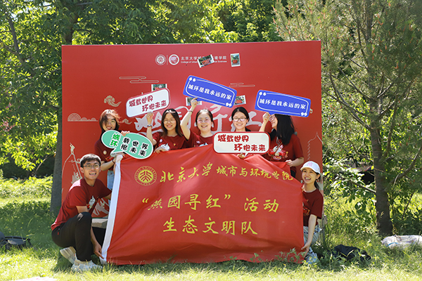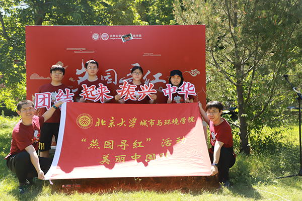 始终与祖国和人民共命运、与时代和社会同前进,通过活动,同学们以小见大,深悟红色传承和专业情怀,更加立志围绕党和人民事业需要,坚定信念扎根祖国大地,守护绿水青山,建设美丽中国,用实际行动展现新时代城环学子的使命与担当。 同学们在各打卡点完成任务 以史铸魂,立青年信仰之本 本次活动为了让党史味道更浓、学习效果更好,将中国共产党百年奋斗历程以“开天辟地”“改天换地”“翻天覆地”“惊天动地”四个阶段依次展现,以习近平总书记对各阶段党史大事的评述指示为主要学习素材,以各阶段内最有代表性的燕园场所为活动节点,设置了相应党史学习专题活动。 从静园草坪出发,“开天辟地”阶段主题游戏为“诵读青春,传承信仰”和“重温长征,感悟初心”。李大钊文章《青春》朗诵视频录制、“长征过草地”游戏使同学们学习体会了建党初期革命先烈不怕流血、不怕牺牲的精神。“指点江山、激扬文字”是“改天换地”阶段主题游戏。在“断桥残雪”石牌坊前,城环学子风华正茂、挥斥方遒,大家开动脑筋,誓将红色经典一一重映。 “翻天覆地”阶段活动点设置在“振兴中华”碑前,“红色旋律,青春之歌”游戏帮助大家再忆1981年排球世界杯预选赛,中国男排在0:2落后的情况下奋起直追的往事。同学们在“团结起来,振兴中华”口号的激励下,通过红歌接唱游戏唱响了时代歌曲,重温了红色旋律,回顾了四十年改革开放的峥嵘历程,感受了北大历史中蕴含的磅礴精神力量。 最后一个环节“惊天动地”阶段主题游戏为“地载万物,理蕴乾坤”,展望全面建设社会主义现代化强国,游戏采用知识问答形式,以中国特色社会主义新时代的重大方针政策中所涉及的地理知识为考点,考察了同学们的掌握领会情况。新时代,新征程,城环青年应该具备更加扎实的专业知识,练过硬本领,担时代重任。 小组合影 本次燕园寻红,主题立意较以往学生党史学习活动更加深远。一是红色基因更加突显,本次活动以党史学习为契机,以定向越野为载体,以北大红色资源为依托,充分挖掘燕园红色基因,用好用活校史红色资源;二是思政寓意更加丰富,燕园寻红融汇了体育、美育、德育、专业教育和红色教育,是一堂内容丰富、形式多元、党团联动、师生共学的思政大课;三是城环特色更加鲜明,通过燕园的人文风貌、自然环境、生态基底,活动使同学们重温“城载世界,环抱未来”专业情怀,立志把科研学术的能力转化为未来建设美好中国的成效。站在“两个一百年”奋斗目标历史交汇点上,学院将进一步创新开拓学生工作思路,鼓舞青年、号召青年、动员青年厚植思政红色文化、深培城环专业情怀、高扬青年奋斗精神,立大志、明大德、成大才、担大任,以青春炫丽之花,向建党百年献礼!