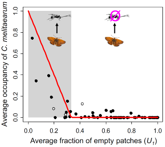 王少鹏研究组基于集合种群理论(metapopulation theory),发展了异质生境中的多物种动态模型,定量预测了食物链中的多样性维持及其对生境破坏的响应。 集合种群理论是种群生态学和传染病学研究的一个经典模型,由著名理论生态学家Richard Levins在1960年代末提出。芬兰生态学家Ilkka Hanski将这一模型扩展至异质生境中,创造性地提出了“集合种群承载力”(metapopulation capacity)概念,将异质景观中的生境复杂性(如生境斑块的面积、空间分布等)简化为一个指标(Hanski & Ovaskainen 2000 Nature)。这一理论被广泛应用于生态保护与管理,但其局限性是只适应用单个物种的种群动态,无法刻画多物种群落。 为此,研究组发展了异质生境中的食物链模型,将集合种群承载力理论推广至多物种群落,定量预测了捕食者-猎物系统的共存条件、以及异质景观所能支撑的最大食物链长度(图1)。模型预测:最大食物链长度随集合种群承载力增加而增加、随捕食者的下行调控(top-down control)增强而降低。这一理论结果将非生物与生物调控作用整合至统一框架下。在特定假定下,该模型给出了一个“经验准则”(rule of thumb):只有当猎物的生境占据比例大于2/3(或空缺比例小于1/3)时,其捕食者才能维持。这一预测得到了芬兰Aland群岛上蝴蝶-寄生蜂系统的验证(图2)。该理论模型为定量预测生境破坏下的生物多样性变化提供了新的工具。 图1. (a)异质生境中的食物链模型:绿色形状表示生境斑块的面积(A_i)和相对距离(d_ij);(b)最大食物链长度的理论预测。其中,集合种群承载力λ表征了生境斑块矩阵(由斑块面积和距离所决定的矩阵)的最大特征值。 图2. 芬兰Aland群岛上寄生蜂(Cotesia melitaearum)的斑块占有比例与宿主蝴蝶的空缺比例的关系。黑色点表示观测数据,红色线表示理论预测。 该研究成果以“Metapopulation capacity determines food chain length in fragmented landscapes”为题,于2021年8月20日在线发表于Proceedings of the National Academy of the Sciences(PNAS)(《美国科学院院刊》)(//doi.org/10.1073/pnas.2102733118)。肉视频