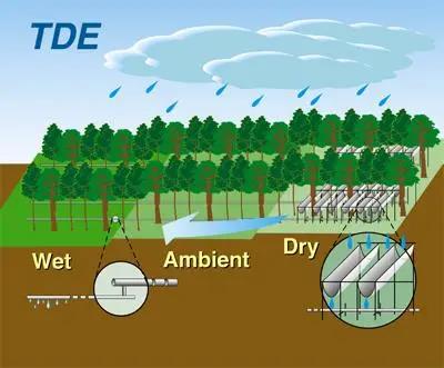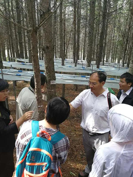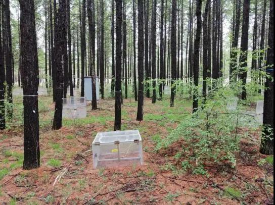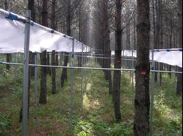 也与紧邻塞罕坝的御道口牧场建立了长期合作关系,于2020年9月开始进行草地生态系统碳水通量观测,同时也配备了一定的摄像物候观测。该样地的建成为林木交错带生态脆弱区对全球变化响应的研究提供了强力的技术支撑,补强了塞罕坝地区草地生态研究。 草地生态系统碳水通量观测仪器 经过三十余年的研究和十余年的监测,北大科研团队在塞罕坝孵化了系列科研成果: 1 刘鸿雁教授研究团队历经三十余年,系统开展塞罕坝及周边地区植被地理与植被生态研究,揭示了这一地区植被格局的成因,重建了这一地区过去植被演化过程,提出了区域林草植被覆盖的合适承载力。尤其是对多个造林树种固碳和耗水过程连续多年的观察,揭示了三北防护林地区主要造林树种小叶杨出现大面积死亡的原因,提出了未来区域植被恢复的策略。研究成果“中国北方生态脆弱区植被动态及其对气候变化的响应”获得2011年度教育部自然科学奖二等奖。参与完成的咨询报告“关于应对气候变化规避三北防护林衰退风险的建议”2020年得到了国家领导人的批示。 2 基于2010年建立的不同林龄落叶松人工林长期氮添加平台和2018年建立的季节不对称性增温平台,朴世龙教授团队对不同生长阶段落叶松人工林生态系统过程进行研究,旨在揭示落叶松人工林对未来气候变化情景的响应与适应。研究团队明确了氮沉降对落叶松人工林生长和土壤碳排放的影响模式,为建立高效、稳定、可持续的人工林提供了理论基础;揭示了落叶松人工林物候对季节不对称性增温的响应,为落叶松人工林建成和应对未来气候变化提供了重要的理论基础,有助于从物候学角度认识人工林生产力的维持机制。 3 基于2010年建设的樟子松人工林养分添加平台,王娓副教授团队对人工林生产力及土壤碳排放动态进行连续监测,改进了菌根真菌呼吸的测定方法,阐明人工林生长和土壤碳排放的响应模式,为人工林可持续管理提供参考。此外,基于不同退化草地氮添加实验平台(2011年起),开展较为系统的草地退化评估与恢复研究,建立草地退化评估指数,明确植物与土壤对人类干扰的响应,为退化草地的恢复治理提供借鉴。 4 郑成洋副教授团队选择塞罕坝45年樟子松人工林,通过穿透雨转移方法,增加、减少样方内+30%、-30%的水分,设立三个处理三个重复森林降水控制平台。研究樟子松人工林降水改变对水分利用效率、森林生长、土壤养分、植物生理等响应。 森林降水控制实验示意图 在未来,塞罕坝站将在现有监测和研究的基础上,以“林水关系”为主线,继续立足人工林生态系统的生态学基础、人工林对气候变化的响应与反馈、人工林生态效应的动态变化、不同造林模式的适应性四个研究方向开展长期定位监测和实验研究。 久久为功,薪火相传 塞罕坝站每年吸引全国多所高校的师生在此开展植物学、生态学、自然地理学、林学等学科的教学实习。 塞罕坝站目前是北大重要的生态学、自然地理学、环境科学的实习基地,也是肉视频