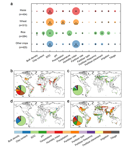 周丰课题组在Nature Food上发表题为“Global mapping of crop-specific emission factors highlights hotspots of nitrous oxide mitigation”的研究论文,首次揭示了全球农田氧化亚氮(N2O)排放因子(EF)的空间分异及其生物地球化学机制,并量化了全球农田N2O减排潜力。 氧化亚氮(N2O)是单分子增温潜势较二氧化碳(CO2)高300倍(100年时间尺度)的强效温室气体,其在大气中寿命可达百年之久,也是平流层臭氧最主要的破坏者。农业是最大的N2O人为排放源,其中农田氮肥施用(含化肥和有机肥)是其主要贡献者。因此,减少农田N2O排放对全球升温控制在2°C 以内是至关重要的。 农田N2O减排潜力取决于EF和施氮阈值,准确确定EF的空间格局,以及量化兼顾粮食和环境安全的施氮阈值目前面临的主要挑战。周丰课题组联合7个国家科研人员,建立了完整且具有更高代表性的全球农田土壤N2O排放通量同化系统,确定了可验证的不同作物的施氮阈值,利用“自下而上和自上而下”耦合方法体系,系统回答3个科学问题:1、全球农田EF的空间异质性多大?2、全球和区域尺度下关键驱动因素是什么?3、在粮食和环境安全前提下,全球农田N2O减排潜力多大,哪里最有效? 研究发现,1)农田N2O EF的空间分异达2个数量级,在以往观测盲区存在多个EF高值区(如中美洲、东南亚、北欧);2)不管是全球还是区域尺度,环境条件(湿润指数、SOC和粘土含量)均是农田N2O EF地域分异的主导因素,而非传统认为的农艺管理措施(图1),通俗地讲,自然条件通过调控“水-土-气”界面化学过程来塑造着N2O排放因子的格局,且调节着农艺管理对排放因子的影响程度;3)在不影响作物产量的情况下,全球农田土壤N2O可减排30%,相当于中国和美国的农田土壤N2O排放之和,其中65%的全球减排潜力集中在20%的播种面积(亚热带湿润气候或潜育土和强淋溶土,图2),换句话说,“小范围,大潜力”,为实现环境和粮食安全的协同效益提供了科学依据。 图1 农田氧化亚氮排放因子空间分异的多尺度驱动因素。a. 全球尺度,b-e. 栅格尺度(3.75° ´ 3.75°) 图2 全球农田氧化亚氮减排潜力 注:图中数字表示20%全球作物收获面积所实现的累积减排潜力 肉视频