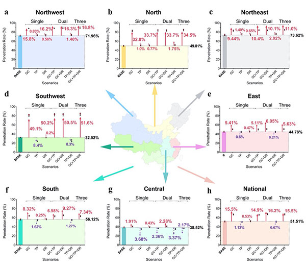 2015级直博生刘来保和国家气候中心王阳高级工程师为论文共同第一作者和通讯作者,李双成教授为论文共同通讯作者。该成果获得国家自然科学基金(41590843)等项目资助。 论文链接://doi.org/10.1016/j.resconrec.2022.106155 图1. 8种风光资源开发情景下,风电、光伏发电满足2050 年电力需求的比例 图2. 基础情景和区域电网互联情景下的2050年风光资源开发最优空间格局