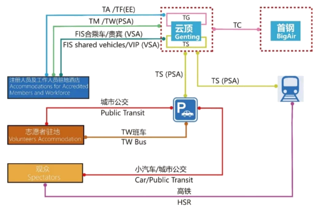 国土空间规划团队目前全程参与了前3个阶段的交通保障工作。 01 规划设计与建设阶段 交通保障工作在规划设计与建设阶段的主要任务是明确赛事交通总目标和办赛理念,明确交通服务标准和指挥架构,并根据赛程、住宿分布、安保要求、场馆分布等上位条件和要求、预测赛事交通需求的时空分布、制定赛事交通服务总体策略,并在此基础上测算交通相关各类用地需求和各类设施需求,针对各类交通设施布局和流线组织规划进行方案设计。 城环学院国空规划团队在本阶段工作中的部分成果如下: 1)完成张家口赛区全部4个竞赛场馆、4个非竞赛场馆、北京赛区首钢滑雪大跳台场馆的交通规划设计方案 在大型赛事中,场馆设施及服务是赛事能否取得成功的根本,规划团队在场馆交通设施规划的过程中,充分考虑了参加冬奥会的8类客户群不同的出行特点及出行需求,按照优先级分别设置各客户群的停车场和上落客位;并结合山地场馆的地形地貌、因地制宜安排各类交通设施和交通流线,以满足车辆通行的坡度、宽度等硬件要求;同时按照安保政策和防疫政策的要求,在场馆前后院区域分别设置交通设施,保证闭环内外区域流线不交叉、前后院流线不交叉。 古杨树场馆群 云顶滑雪公园 张家口颁奖广场 张家口冬奥村主入口 张家口冬奥村班车站 北京首钢滑雪大跳台 2)完成张家口赛区8个临时交通场站的规划设计方案 规划团队在张家口赛区临时交通场站的选址及规划设计过程中主要基于以下原则:交通场站结合地形条件,集约用地、减少工程量;考虑车辆出行需求,场站与服务对象驻地就近布置,减少车辆空驶;交通场站与安保政策和防疫政策结合,闭环内车辆与闭环外车辆各自集中,减少场站内不同的交通分区和交通设施需求,集约利用。基于上述原则,团队完成了张家口赛区所有8个临时交通场站的功能安排、场站规模测算、场站选址、场站停车、出入口、功能用房交通设施总平面图布局方案,并在后续施工图设计和实际建设过程中提供了全流程的咨询与对接服务,保障张家口赛区临时交通场站的高标准建设与运营。 交通场站内车行和人行流线示意图 张家口赛区棋盘梁交通场站 张家口赛区冬奥村北交通场站 张家口赛区会展东交通场站 张家口赛区马丈子交通场站 3)完成张家口赛区核心区道路及交通组织整合方案 张家口赛区核心区是张家口赛区所有竞赛场馆和非竞赛场馆所在区域,也是赛区铁路交通枢纽太子城高铁站所在地,是赛事交通出行的重点保障区域。规划团队针对赛事出行需求,对张家口赛区核心区道路交通提出单行组织方案,最大程度减少流线交叉;同时对核心区内各类场馆、场站、高铁站等交通设施出入口与道路的关系、车辆在整合核心区内的运行流线进行全面整合与优化,以减少车辆流线交织、降低与道路连接的出入口等节点的交通拥堵,提高核心区道路及其他交通设施整体运行效率。 核心区交通设施整合图 张家口赛区核心区效果图 02 运营准备阶段 1)张家口赛区核心区各场馆交通组织方案仿真测试 规划团队以赛时各客户群体的交通需求为背景,对赛时交通集疏散方案通过模型仿真的方式进行评估。他们应用PTV Vissim交通仿真软件,结合不同的集疏散方案,对张家口赛区奥运场馆、核心区道路能力、交叉口运行状态、班车上落客位秩序等多方面的运营状态进行仿真运行,依据结果评估集疏散方案优劣性,并加以不断修正,同时提出相应的交通管控和交通需求管理政策建议,为保障赛时交通的良好运营提供依据。 核心区场馆及道路仿真模型 2)张家口赛区系列测试活动及演练活动交通保障支持 规划团队为2021年冬奥会和冬残奥会张家口赛区系列测试活动和相关演练活动提供技术支持,包括测试活动交通运输保障方案的编制、演练活动方案的编制、测试活动和演练活动的现场技术支持等。通过一系列测试活动的举办和实地演练,他们总结了交通保障组织架构、交通运行、场馆交通流线组织等多方面经验,进一步细化了冬奥正赛的交通运行方案,优化了道路交通组织流线、停车场设计、上落客区设计等。 张家口赛区测试活动交通服务模式图 3)张家口赛区太子城高铁站与崇礼高铁站交通运行计划编制 为保障2022年北京冬奥会期间张家口赛区太子城高铁站和崇礼高铁站出行的服务品质和服务效率,规划团队按照站内外全流线的要求,结合疫情防控,重点按人群开展交通组织设计,并在此基础上配合编制两个高铁站的交通运行计划,明确交通保障团队的组织架构、人员点位安排和各类客户群的进出站流线及防疫分区。 太子城高铁站效果图 崇礼高铁站效果图 高铁站隔离护栏 交通保障团队组织架构 03 赛时运营阶段 在赛时运营阶段,规划团队根据编制好的运行方案开展实际交通运行保障工作,并根据抵离计划变更、赛程变化、交通拥堵、恶劣天气等临时状况,应急调整运行方案,完成交通服务。 冬奥会期间,规划团队全程参与了张家口赛区交通保障的组织工作,还得到2008年北京奥运会交通专家金砚铭主任的现场指导。 团队参与冬奥交通组织技术服务 受疫情影响,本届冬奥会组织面对不同以往的特点和挑战。北大城环交通专家在为这届特殊的冬奥会提供咨询和服务的同时,也收集第一手的运行数据,为特殊情况下大型赛事的交通组织与交通设计积