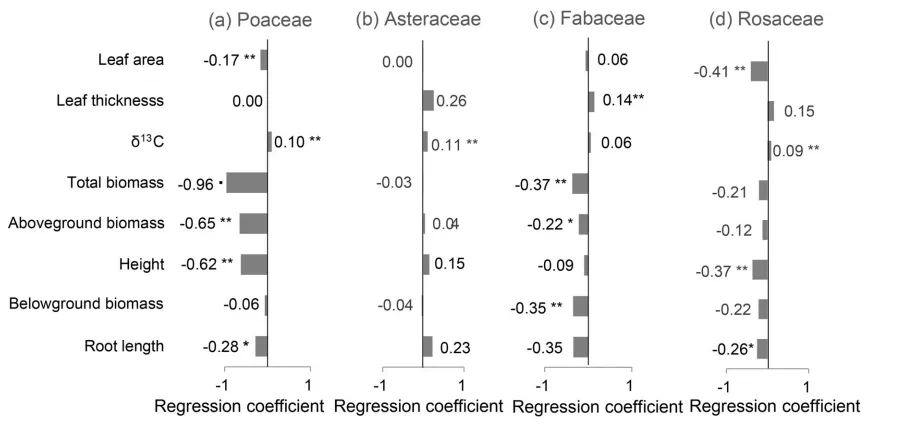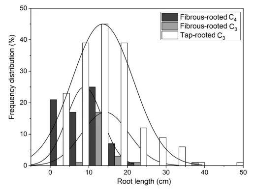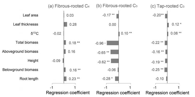 2016级生态学专业学生蒋璐冰同学拔尖计划研究成果“Root system plays an important role in responses of plant to drought in the steppe of China”以第一作者在《Land Degradation & Development》发表文章。 除气候外,土壤质地也能影响土壤水分的运动与分布,对植物的干旱相关功能属性产生影响。然而,以往对植物功能属性的研究主要关注气候导致的水分亏缺,而对土壤导致的水分亏缺关注较少。本研究基于样带调查数据,以中国北方温带草地上分属三个功能类群(须根系C3植物、须根系C4植物、直根系C3植物)的12种广布植物为研究对象,研究了干旱指数和土壤质地对植物功能属性的影响。 图1 研究区与采样点图 在研究关注的物种中,须根系C4植物的根长较短,与须根系C3植物和直根系C3植物都有显著差异(图2)。 图2 三个功能类群的根长分布 随干旱指数的增加,须根系C4植物与直根系C3植物/须根系C3植物的功能属性响应相反。研究发现,干旱对须根系C3植物的总生物量、地上生物量和株高的影响都强于对直根系C3植物和须根系C4植物(图3),而对主要由须根系C3植物组成的科(禾本科)的影响也强于对主要由直根系C3植物组成的科(菊科、豆科和蔷薇科)(图4)。 图3 干旱指数对须根系C3、须根系C4和直根系C3植物功能属性的影响 图4 干旱指数对禾本科、菊科、豆科与蔷薇科植物功能属性的影响 研究还对比了影响各功能类群植物的功能属性的因素,结果表明,干旱对所有功能类群植物的功能属性均有影响,对须根系C3植物的影响尤为明显。土壤质地对大多数植物功能属性的影响不显著,但须根系C3植物和直根系C3植物表现出了随土壤质地变粗的根长增长。 研究表明,植物根系可能在植物的干旱响应中非常重要,除气候外,土壤质地也会对植物生长产生影响,需要在未来研究中被考虑。 肉视频