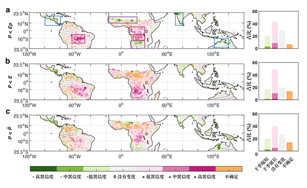 二年级硕士生徐浩为第一作者,朴世龙院士为通讯作者。 论文链接://www.nature.com/articles/s41467-022-31826-y 图1. 1983-2016年热带干季长度变化。P< 指仅考虑降水,P<Ep指同时考虑降水和潜在蒸散发,P<E指同时考虑降水和实际蒸散发。