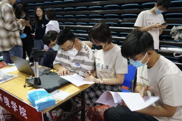 党委书记郝平、校长龚旗煌亲切到场看望。学院院长贺灿飞,党委书记彭建,副院长李本纲,党委副书记张新平,党政综合办公室主任刘萍,科研外事办公室主任汪淼,本科生教务宫彦萍,团委书记、学工办主任谭卓立,团委常务副书记宋宛儒,学工办副主任杜宇,及四十余名志愿者同学们全天等候新生同学们的到来。 凌晨五点多,天刚蒙蒙亮,伴着清晨的第一缕微光,学院的老师和同学们已经早早在邱德拔场馆布置好会场,准备好迎新需要的手册、展板、横幅、易拉宝等各项物资。七时许,第一位新生到达现场,正式拉开迎新的序幕,开启忙碌而充实的一天。 城小环玩偶静候大家的到来 迎新物资已准备齐全! 万事俱备,静候新燕 为更好地迎接新生,给他们一个完美的燕园新起点,学院的老师同学们在暑假期间紧锣密鼓地开展各项统筹规划工作,将迎新的细节逐步落实到位。收集学生信息、设计迎新展板、准备纪念物资、招募志愿团队、发布迎新推送……每一项工作老师亲自把关,同学积极参与,大家齐心协力全方位完善工作内容,确保新生初入燕园,就能感受到家一般的温暖! 相聚有时,共启新程 经历漫长的准备工作之后,迎新的日子终于到来啦!同学们或认真细致完成资料的核查,或畅快地和学长学姐们谈天说地,或热情地接受迎新采访,“简要介绍一下自己吧……说说你对未来生活的期待和愿景……”,在迎新易拉宝前留下自己的惊喜与憧憬,祝福与期待,或骄傲地高喊“城载世界,环抱未来”,正式开启城环人的新篇章! (快来一览新生们的风貌!) (叮!快乐打卡~) (接受采访的新同学) 热闹的迎新现场 师长助力,温暖相伴 从第一位新生笑意盈盈入场,到最后一位同学满怀期待离开,肉视频