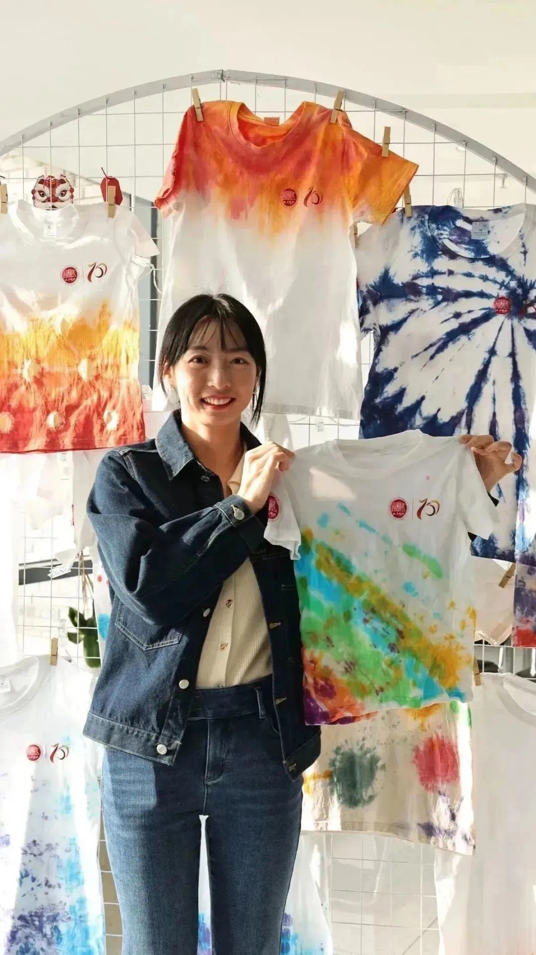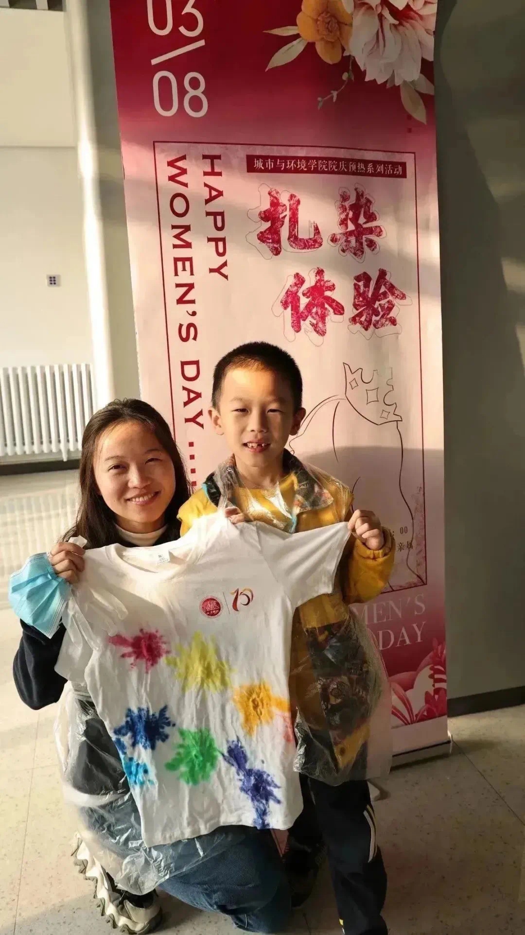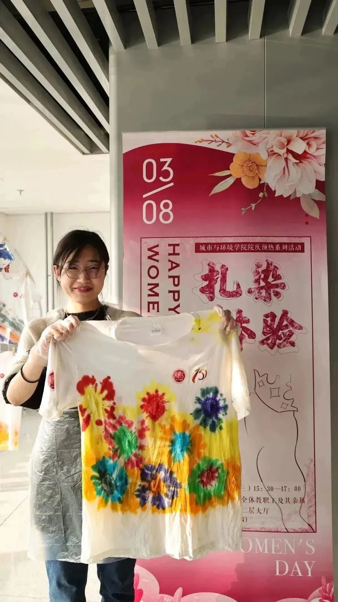 地理学科建立70周年和城环学院建院15周年献礼。学院党委书记彭建、党委副书记陈耀华、副院长曹广忠和金鑫也来到现场,为参与活动的各位教职工送上节日祝福。 学院领导到场慰问 扎染是中国民间传统的染色工艺,主要分为扎结和染色两部分,通过纱、线、绳等工具,对织物进行扎、缝、缚、缀、夹等多种形式组合后进行染色。经过工作人员的简单介绍,大家迅速掌握了扎染技术的基本方法,迫不及待地投入到作品创作中。 活动现场 妙手生花,巧思尽显。用玻璃弹珠扎结花朵、用皮筋木片旋转捆绑,简单的白色T恤在大家手中被赋予了多姿造型,意想不到的惊喜正在被悄悄创造。 不同扎结方法的作品 耐心晕染、精心点缀,斑斓的色彩在大家的创意组合下呈现出无穷变化。自由豪放的泼墨、简单雅致的渐变、活泼可爱的花卉、自由奔放的火苗……或独自挥毫,或亲子联动,大家全情投入、用心创作,将艺术和美好心情融入一件件匠心独具的扎染作品中。 大家认真创作 固色濯洗,沉淀绚丽。浸泡结束后,一份份“扎染盲盒”被陆续开启。奇妙的扎结工艺让原本简单孤立的色彩渲染拓展为大片如梦如幻的斑斓,碰撞交织的花纹图案让原本无心之举的勾勒也变得如神来之笔一般。接连不断的惊喜让活动现场更加其乐融融,大家相互展示自己满意的作品,赞美之声一时不绝于耳。最后,大家纷纷与自己的作品合影留念,定格这份与扎染邂逅的美好回忆。 大家与自己的扎染作品合影留念 本次活动不仅让大家体验到扎染技艺的独特魅力,促进了教师间的交流,也弘扬了中华民族传统文化、陶冶了大家的艺术情操,使老师们在繁忙的工作中放松身心,同时收获了一份独特作品。 活动合影