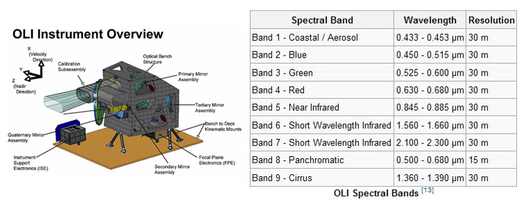 Landsat TM8 数据于2013年2月11日发射升空,飞行高度 705公里,环绕地球时间98.9分。数据共有11个波段,包括9个光谱波段,2个热红外波段,相幅大小 170 km X 185 km,卫星设计运行时间 5年。