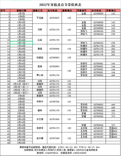 结合当前防疫工作实际,按照学校《关于做好寒假和春节期间工作的通知》,为确保寒假及春节期间学院管理服务工作正常有效运行,现就寒假假期带值班工作通知如下: