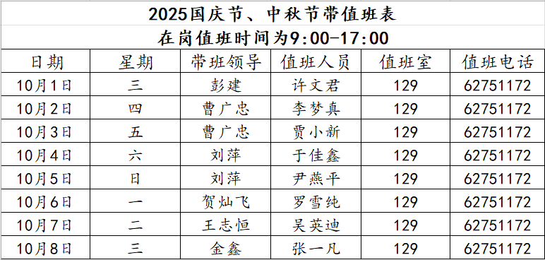 根据学校要求,10月1日至8日,学院每日安排1位工作人员在岗值班,值班地点:129值班室,值班时间:9:00-17:00。同时每日安排1位带班领导,带班时间9:00-次日9:00,要求带班领导在京保持通讯畅通并能及时返校。