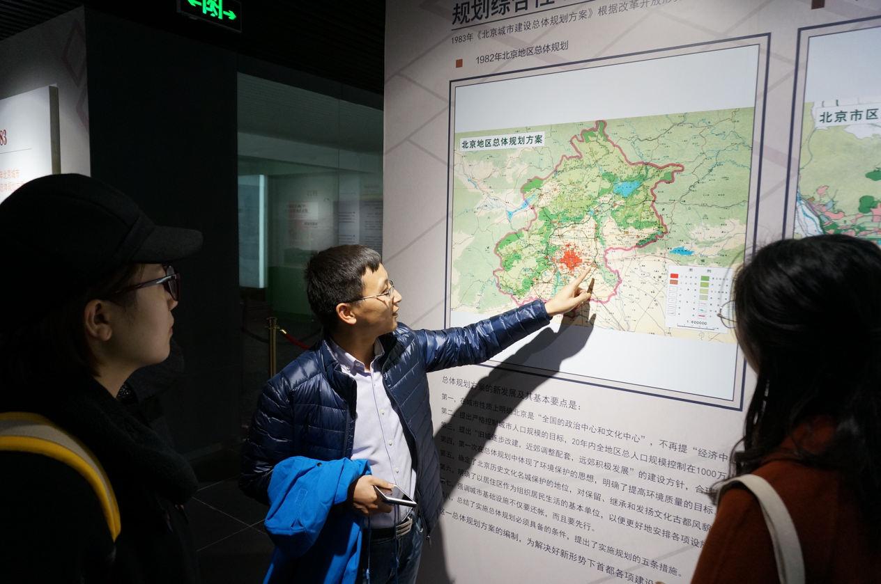 同学们首先来到北京市历次城市总体规划的展区,认真学习了1953、1958、1973、1983、1993、2005各版城市总体规划,其时代主题、中央精神、城市性质、人口规模、规划特点等背景和内容要素各不相同,但又有着深刻的时代意义。这些规划充分反映了建国以来北京市的战略定位与城市发展变化,既是北京城的历史写照,更是国家发展进步、人民生活改善的时代缩影。刘涛老师从人口地理的角度分析了城市总体规划中对于人口集聚和疏解的导向作用,同学们也就此展开了讨论。