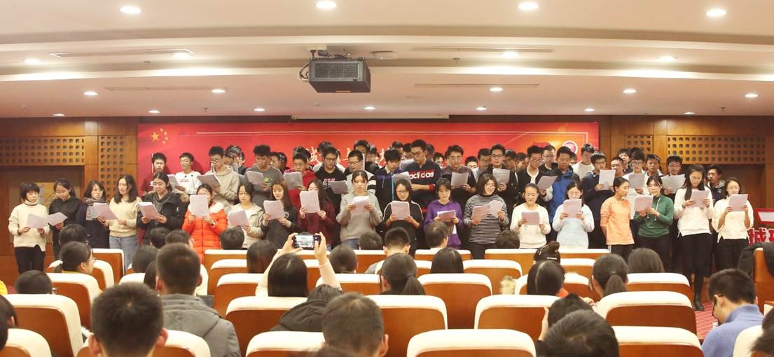 接下来,贺灿飞宣读了学院对重大活动参与师生的嘉奖令,刘耕年、贺灿飞、石长翼、陈耀华、张新平、李晓瑭为师生颁奖。之后,2019级本科新生合唱一首《国家》,全体与会成员齐唱《同心共筑中国梦》,以歌声表达对祖国深沉的爱,向祖国献礼。现场仿佛回到了重大活动当日,同学们激动地挥舞起手中的红旗,“团结起来,振兴中华”的口号响彻会场。