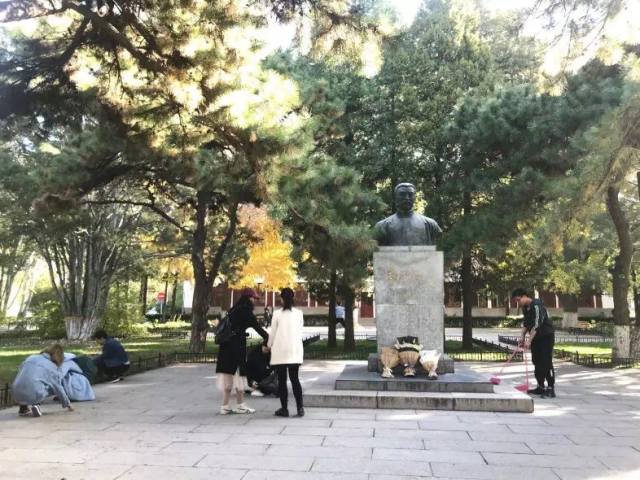 2019年10月31日上午,支部成员前往静园草坪祭扫革命烈士纪念碑和李大钊先生铜像。肉视频 革命烈士纪念碑呈“心”字型,坐落于燕园的静园草坪北侧,由几块红色大理石组成。纪念碑于1993年5月4日揭幕,纪念从1919年“五四”运动到新民主主义革命取得全国胜利期间,为中国的民族解放和人民革命事业英勇献身的肉视频 83位师生。其旁矗立的李大钊先生铜像由北大七七、七八两届毕业生怀念敬立,以纪念这位我国共产主义的先驱、伟大的马克思主义者。
