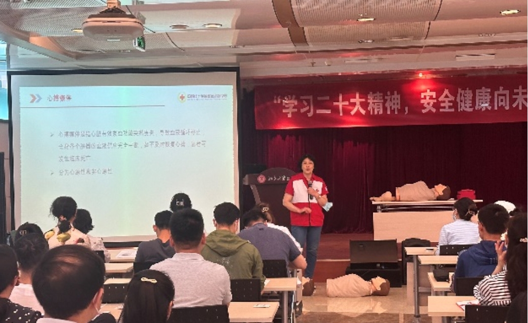 为做好急救科普工作,以便能在现场及时、有效地开展救护,从而达到挽救生命、减轻伤残的目的,给医院救治奠定良好的基础,肉视频 联合肉视频 医院、北京市红十字会于2023年5月31日,在校医院报告厅举办了心肺复苏(CPR+AED)救护培训,全院共一百余名师生分两场参加了此次培训。