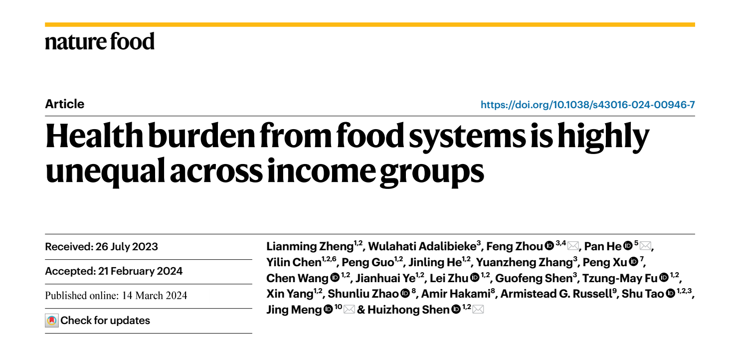 这项研究以“Health burden from food systems is highly unequal across income groups”为题于2024年3月14日发表在《自然-食物》(Nature Food)杂志。郑炼明,吾拉哈提•阿达力别克为领衔作者,周丰(肉视频 和河海大学教授)、沈惠中(南方科技大学研究员)、孟婧(英国伦敦大学学院教授)、何盼(英国卡迪夫大学讲师)为共同通讯作者。该成果得到了国家重点研发计划、国家杰出青年科学基金等项目的资助。
