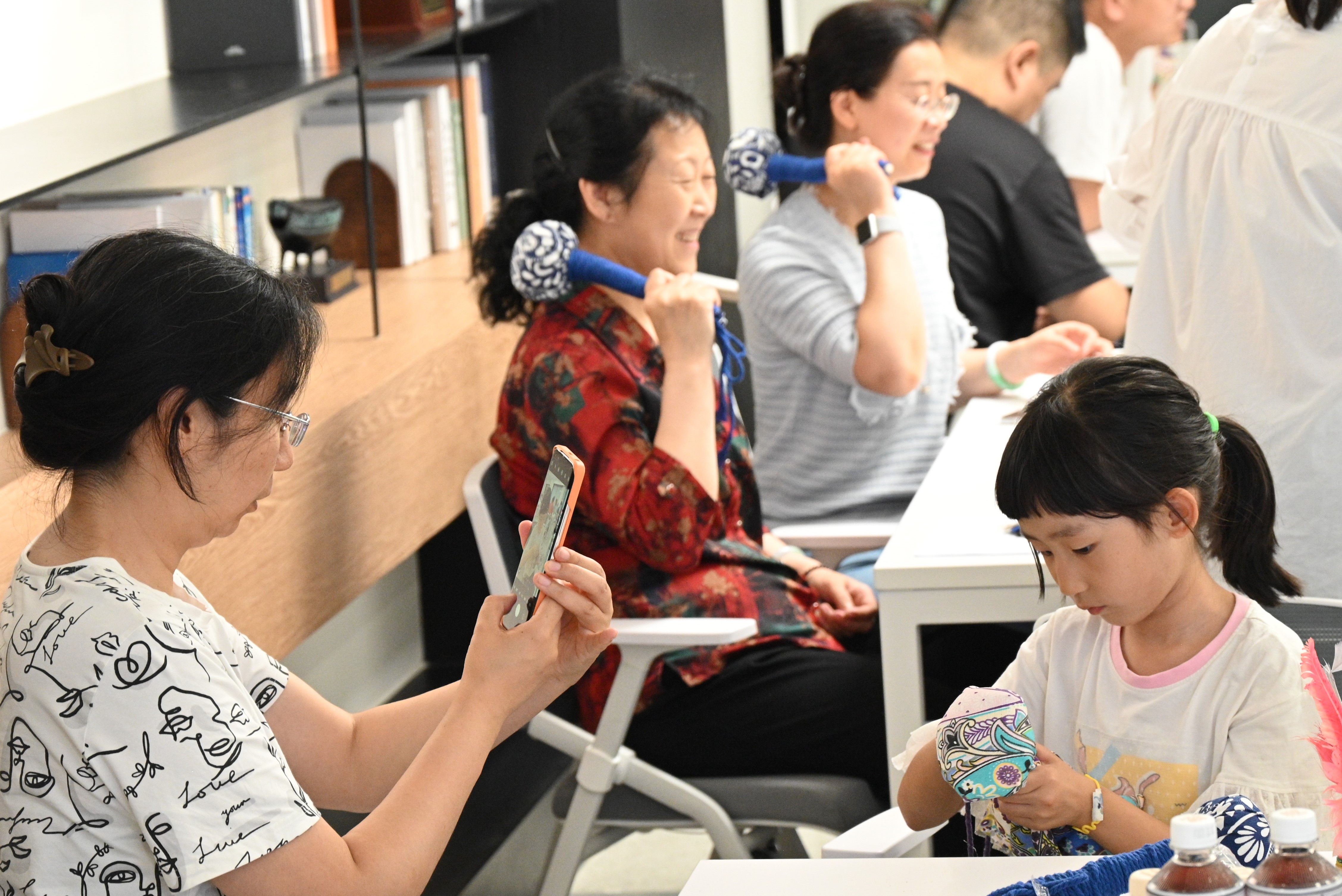 听完文化讲座,大家围坐一起动手制作艾草锤,先将艾草和中草药团成一个拳头大小的紧实球包,然后将木棍插入艾草包中,再拿布料包裹,用彩色绳子缠起来。由此一个个各具特色,实用又美观的艾草锤就制作完成了。老师们迫不及待地使用起来,拿着它捶背敲肩,爱不释手。“这个艾草锤里有中草药香,可以按摩经络、舒缓不适,对我们伏案之人很有用。”