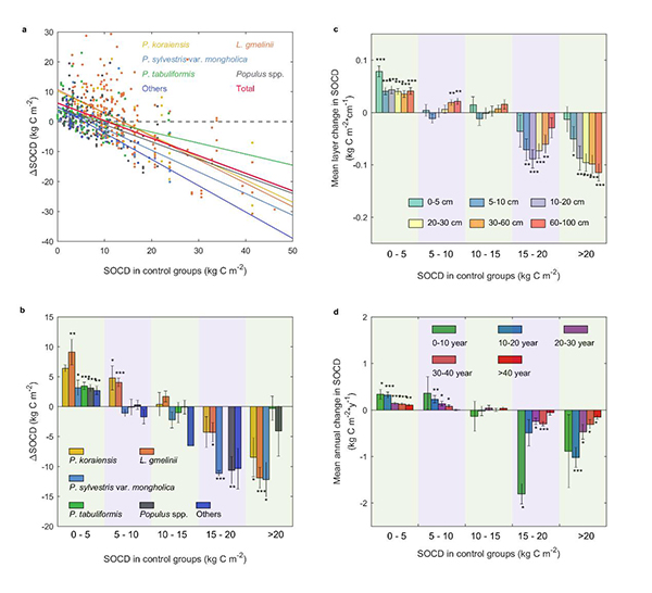 在当前气候变暖的背景下,植树造林被普遍认为是应对气候变化的重要措施之一。但科学界对于植树造林的固碳潜力到底有多大还存在很大的争议。尤其是,相比于植被碳储量,土壤有机碳对植树造林的响应仍然是悬而未决的科学问题。