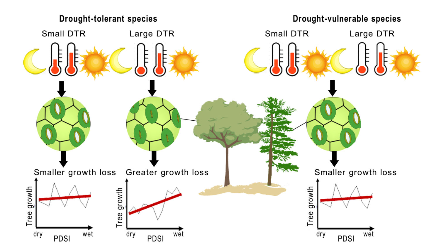 全球变暖背景下,干旱的加剧造成大范围的树木生长下降或死亡现象,严重影响着森林的碳汇功能。已有研究一致表明白天升温比夜晚升温速率快加剧了干旱对树木生长的不利影响,而夜晚升温与干旱的协同作用既可能加剧也可能缓解干旱对生长的不利影响:人工模拟控制试验的结果大多表明夜间增温加剧了干旱的不利影响,而自然条件下的研究表明夜间增温减缓了干旱的不利影响。这可能是不同树种的不同抗旱策略导致树木对夜间增温的差异化响应。由于不同树种在面对干旱时的应对策略不同,随着变暖的加剧,昼夜温差变化与干旱的交互作用如何影响不同树种的生长依然是一个谜题。