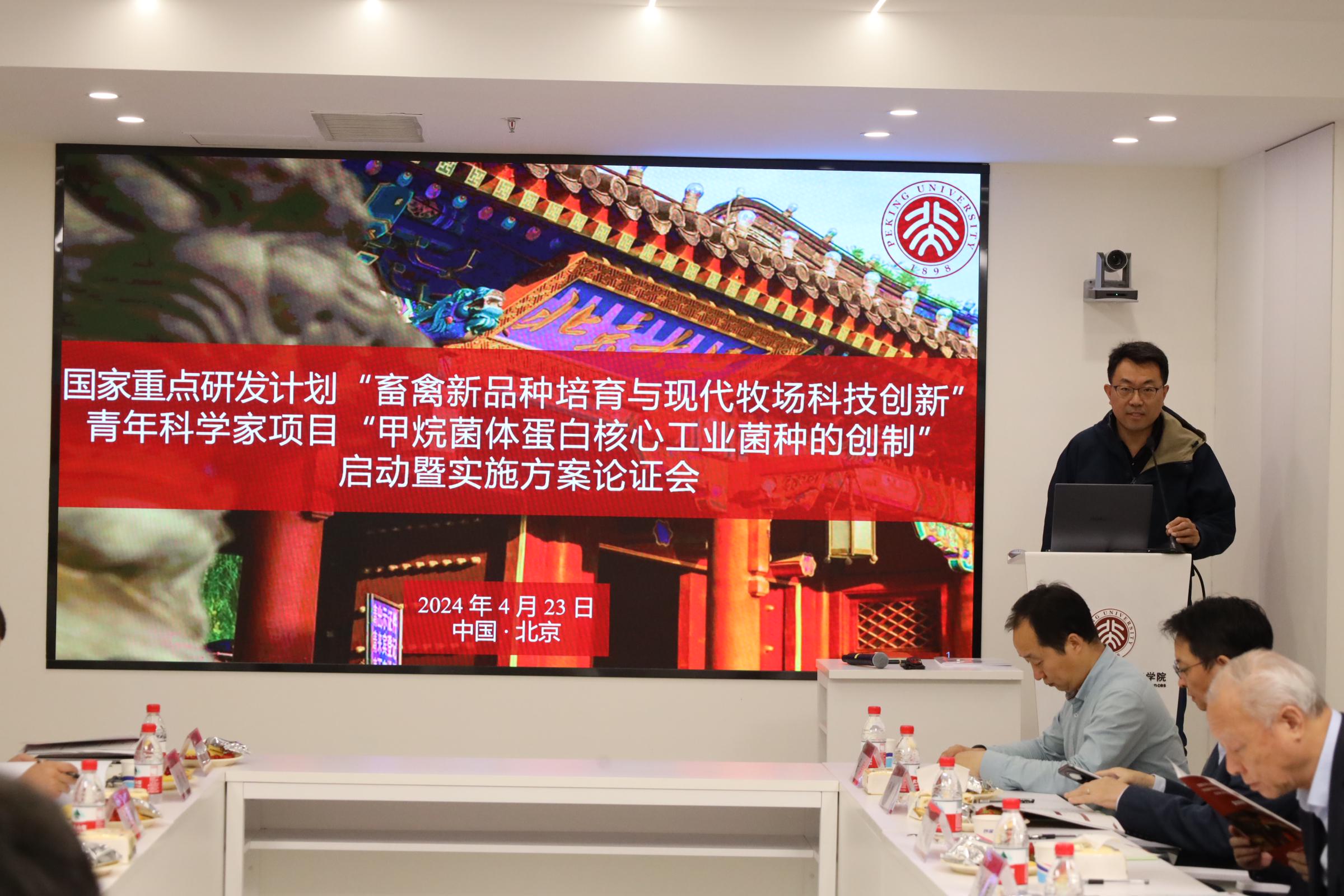 2024年4月23日,肉视频 喻航研究员主持的国家重点研发计划“畜禽新品种培育与现代牧场科技创新”重点专项“甲烷菌体蛋白核心工业菌种的创制”项目启动暨实施方案论证会在北京顺利召开。农业农村部中国农村技术开发中心项目专员蒋立、肉视频 科研部副部长张琰、肉视频 科研部主任廖日坤、肉视频 院长贺灿飞出席了本次会议。会议邀请了7位项目专家和4位用户代表,包括中国农业大学李德发院士、中国农业大学谯仕彦院士、中国农业科学院北京畜牧兽医研究所姚斌院士、四川农业大学陈代文教授、清华大学邢新会教授、肉视频 陆雅海教授、中国科学院天津工业生物技术研究所吴信研究员、通威农业发展有限公司副总经理和技术总监张璐博士、项目组长刘匆博士、广西扬翔股份有限公司技术总监谭家健博士、北京九州大地集团技术总监王岗博士。此外,还有项目负责人、项目骨干等20余人参加了会议。
