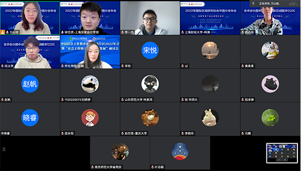 分会场十二以“区域均衡发发展与社会公平”为主题,由上海交通大学国际与公共事务学院卢婷婷副教授、湖南大学公管学院谷浩老师主持。华南理工大学刘于琪老师首先介绍了中国城乡社区人居环境对老年人心理健康的影响相关研究;中山大学潘卓林博士讨论了深圳市新移民社会空间分异问题;侯奕廷、常铖等同学分别以澳门、北京五道口为研究案例探讨了社会空间隔离、外国学生社区治理等问题。接着,尧文洁、费子娟、李美娜、周小孟等同学重点关注了中国西部地区水碳供需关系、资源比较优势、生态转移支付与经济-环境-旅游耦合等关键问题,对区域均衡发展各抒己见。分论坛下半场,卢婷婷副教授介绍了有关上海住房产权分异与城市基础设施分化空间关系的研究成果;穆学英、陶卓琳、盛涵天等老师同学分别就住房产权获得、城市公共设施优化模型、区域经济韧性等话题关注到城市、区域治理问题。之后,张渼铉、杜彤云、常江与林育豪等老师同学探讨了城市街道空间治理、城市更新、社区贫困、流动人口再生育意愿等前沿研究问题。