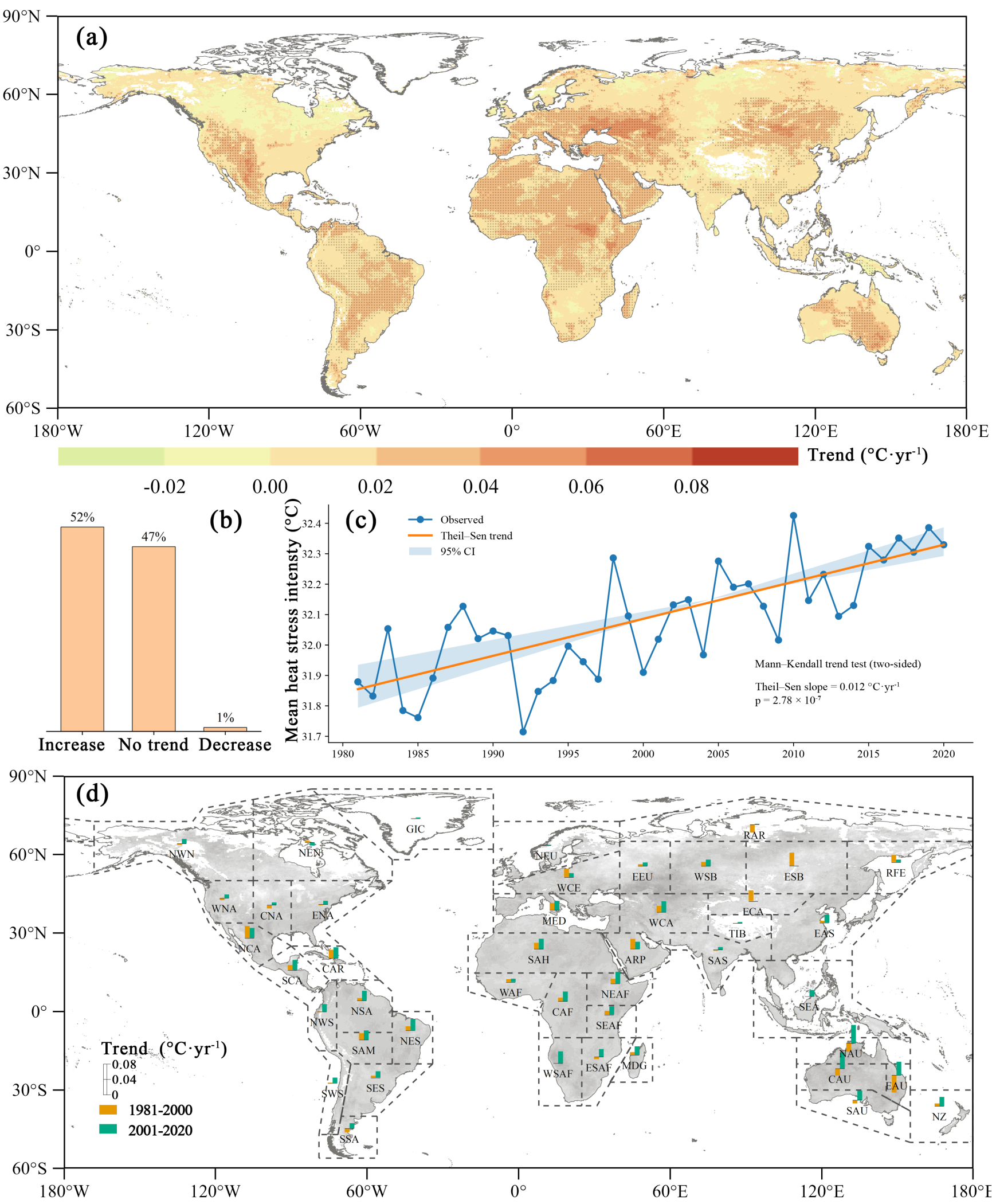 研究结果表明,1981-2020年间全球平均热应激强度呈显著上升趋势,约52%的区域表现出平均热应激强度的显著增加,整体增速为0.012°C·yr⁻¹。其中,2001-2020年阶段的年均增长率达到0.017°C·yr⁻¹,几乎为1981-2000年阶段的两倍。极端热应激天数的上升趋势更为显著,约67%的区域呈现显著增加,整体增速为0.429天·yr⁻¹。2001-2020年期间,其年均增长率高达0.772天·yr⁻¹,约为1981-2000年阶段的近三倍。低纬度热带地区,如中非、北非以及南美洲季风区,增幅尤为突出。归因分析进一步表明,人为气候变化对热应激上升趋势的贡献显著高于自然气候变化,且在极端热应激天数方面尤为明显。2001-2020年间,人为气候变化驱动的趋势分别达到0.015°C·yr⁻¹(平均热应激强度)和0.491天·yr⁻¹(极端热应激天数),均显著高于自然气候变化的贡献。此外,低收入经济体的热应激增长速率为高收入经济体的两至三倍,表明人为气候变化不仅强化了全球热应激,也加剧了不同经济体之间的空间不平等格局。