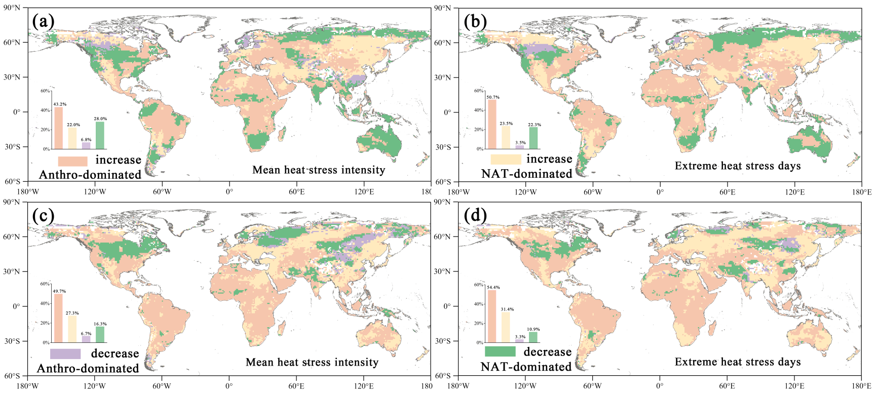图2.全球平均热应激强度和极端热应激日数变化类型的分布及面积占比