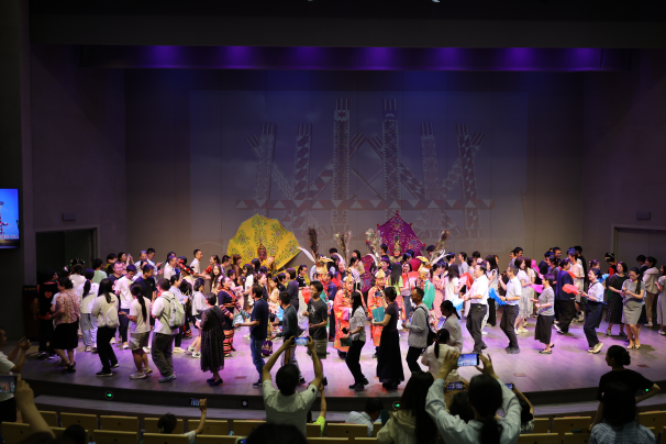 活动现场互动氛围热烈,文化传递也无处不在。南涧彝族跳菜舞者向观众递出的苹果,传递着美好的祝福;众多观众特别是青少年踊跃参与Kinnara神鸟舞环节,跟随传承人学习模仿孔雀神鸟的姿态,在肢体的律动中感受对自然的热爱;澜沧拉祜族的芦笙舞表演者与观众展开趣味问答,通过“磨刀”、“犁地”、“蛙跳”等形象动作,生动讲述民族祖先探索世界、记录生活的奇妙历程;最后,在景颇族目瑙纵歌的欢快音乐中,全场观众一同登台,手牵手随乐起舞,共同唱响齐聚一堂的喜悦,用舞步描绘出中华民族团结奋进的生动图景,将活动气氛推向高潮。