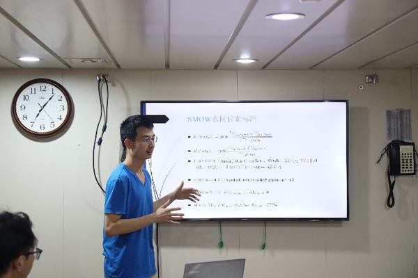 读书之人不慕名利,更重“神交”,“科学”号在“作站”之余也给了我们不少“神交”的机会,小组内讨论技术细节,组间交流科学问题,也是一大幸事。船上有不少好书,也有不少好书之人,阅读之中,心领神会,从《深海浅说》到《人类简史》,心意相通,好不乐哉!除了这些日常的交流,“科学”号在站间空隙插出的学术报告更是充满着思想的火花。学术报告由首席张国良研究员打头,开篇洋洋洒洒两个小时,从星际空间一直讲到板块深部的碳循环,给我们后面的报告人做了示范却也给了不少的压力。梁雍祺和安永睿在站间航渡分别做了报告,其一是安永睿的“稳定水同位素原理与其海洋学应用”,其二为梁雍祺的“放射性碳同位素示踪大洋环流”。