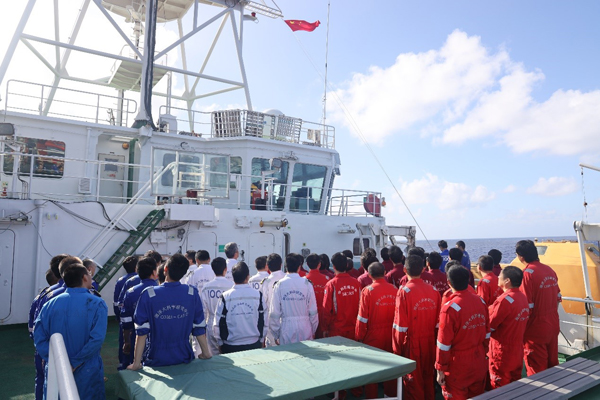 北京时间2021年1月1日上午8点,国家自然基金重大项目“西北太平洋地球多圈层相互作用”NORC-581航次的全体研究人员和船员们在登艇甲板上举行了一次特别的升旗仪式。伴着国歌,国旗徐徐升起,迎风飘扬,大家行着注目礼,内心的庄严感与使命感油然而生,航行在西太平洋上,我们仍与祖国连在一起!中共十八大报告提出,提高海洋资源开发能力,发展海洋经济,保护海洋生态环境,坚决维护国家海洋权益,建设海洋强国,这是中国特色社会主义事业的重要组成部分。我们要提高海洋科技自主创新能力,跟踪和探索海洋领域的重大科学问题,提高勘探开发海洋资源的水平,加快建设海洋强国。而如今,我们也希望能够通过自己的从事的海洋相关研究为我国海洋强国的建设贡献一份力量。