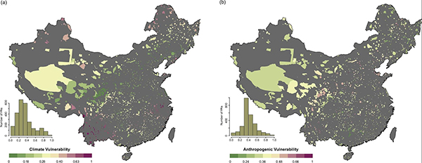Spatial patterns of species vulnerabilities across protected areas in China.