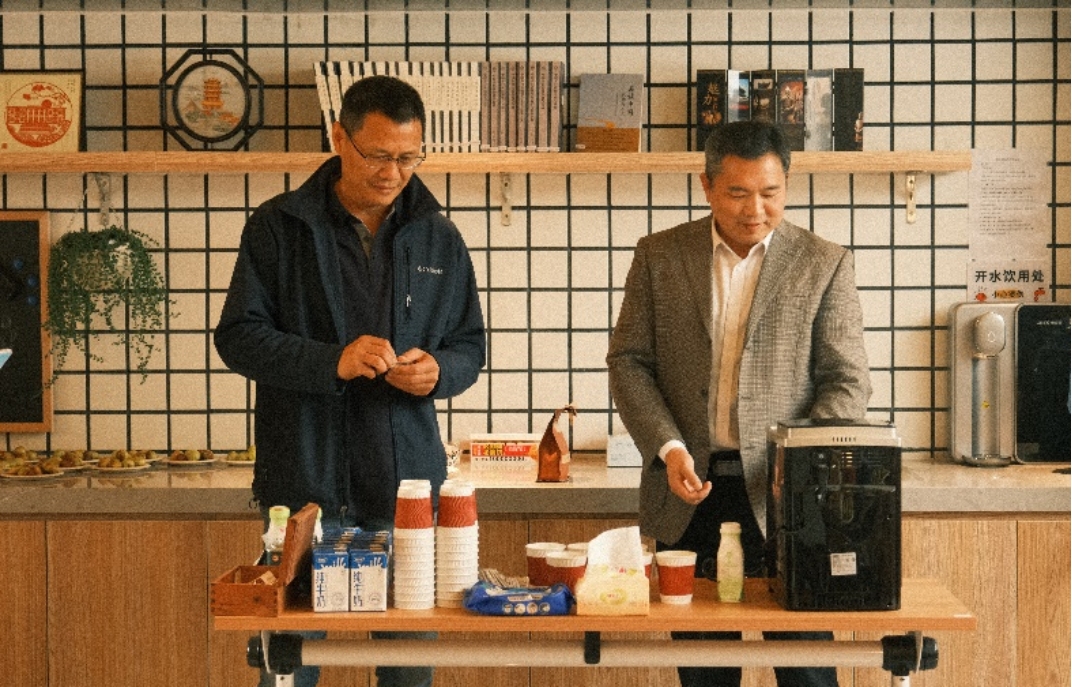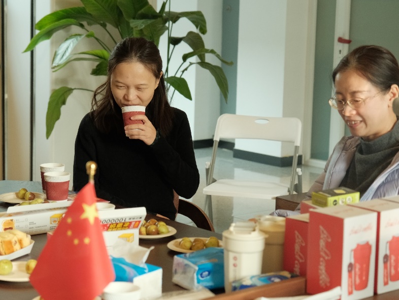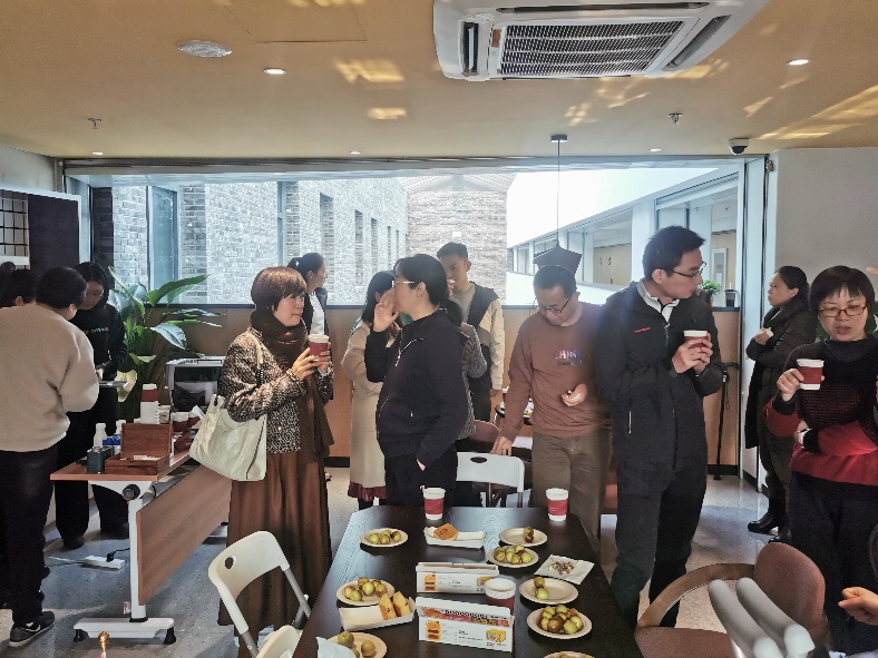四楼空间以咖啡会友交流为主,学院老师携带着不同风味的咖啡豆前来,研磨调配出美味咖啡饮品。大家围坐一起,品尝着咖啡、水果和小点心,分享着心情,交流着学术研究进展。在品味咖啡活动中,还举行了教工羽毛球队的颁奖仪式,党委书记彭建、副院长李本纲和王志恒分别为队员颁奖,感谢队员们在北大教职工羽毛球锦标赛中的精彩表现和努力。空气中弥漫着咖啡的醇香,飘荡着欢声笑语,虽是清冷的冬日,大家却感到暖暖的幸福。