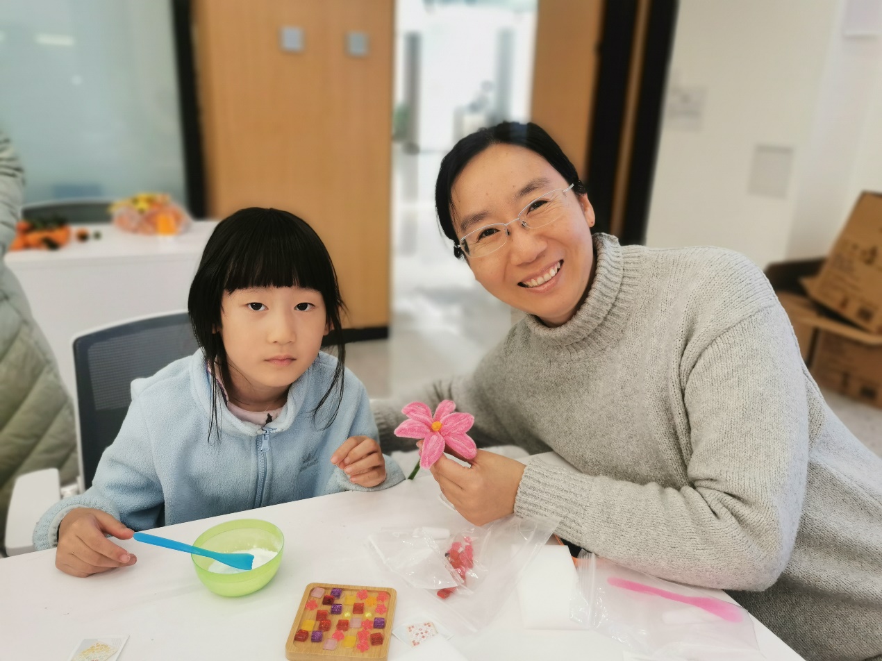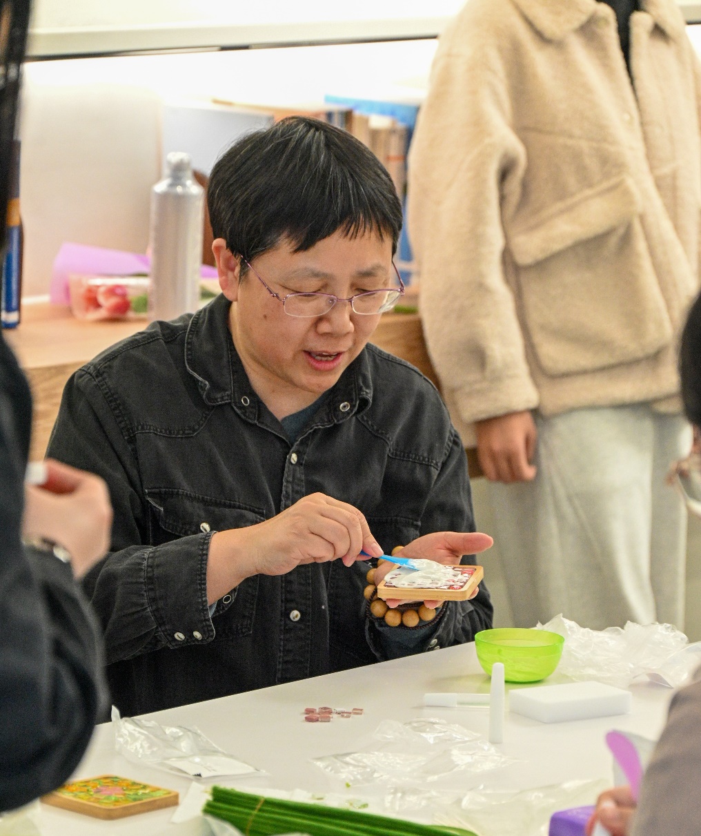 创意手工活动的现场则是另一番热闹景象。轻音乐缓缓流淌,营造出一种温馨而惬意的氛围。桌子上摆着五彩缤纷的扭扭棒、大大小小的杯垫、闪闪亮亮的装饰物……老师们忙碌的身影此起彼伏。她们或低头专注于手中的材料,用灵巧的手指编织,将一根根彩色的扭扭棒变成可爱的花瓣;或三五成群地聚在一起,热烈讨论着设计思路,互相启发,互相学习。空气中弥漫着淡淡的花香和胶水的味道,与老师们欢快的笑声交织在一起,宛如一首动人的乐章,让人陶醉其中。