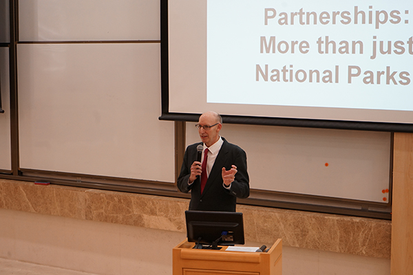 开幕致辞后为主题报告第一环节,由北京林业大学园林学院旅游管理系丛丽副教授主持。美国西弗吉尼亚大学游憩、公园和旅游科学系主任Robert Burns教授作了题为《游客监测:美国西北太平洋案例研究(Visitor Monitoring: USA Pacific Northwest Case Study)》的主题报告,介绍了美国户外游憩活动发展现状,并以哥伦比亚河峡谷国家风景区(Columbia River Gorge National Scenic Area)为案例分享了美国国家公园的游客管理经验与策略。美国农业部森林局国家森林游客监督项目主管Donald English博士以《美国国家森林游客监控(National Visitor Use Monitoring: Overview)》为题,介绍了美国国家森林进行游客到访量测量与游客行为监控的目标、程序、取样方法、评估以及目前存在的问题。北京林业大学园林学院旅游管理系丛丽副教授以《野生动物保护与游憩视角下的国家公园游客行为管理(The Tourist Behavior Management in National Park for Wildlife Conservation and Recreation)》为题,指出了在当今野生动物加速灭亡与可持续发展背景下,国家公园需要在保护野生动物与自然资源的前提下进行合理利用、对游客行为进行监控管理,并介绍了南非、加拿大与澳大利亚三个国家公园的野生动物保护经验。