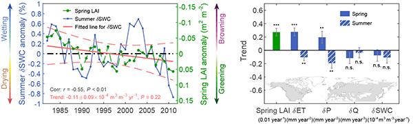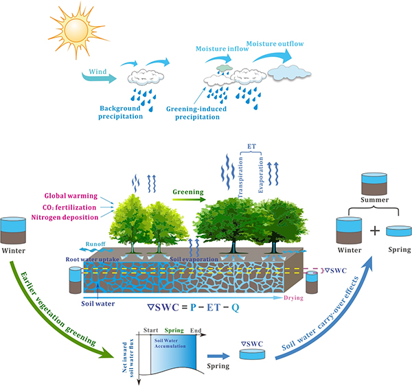 遥感和地面观测均证实升温导致北半球植被春季物候提前。春季物候提前通过增加光合时长和光合速率从而有效提高植被生产力;另一方面,春季物候提前会加快土壤水分消耗,改变局地水循环和气候的季节动态。但相比于物候提前的碳汇效应,学术界关于北半球春季物候提前对水循环和气候的生物物理反馈机制,尤其是跨季节滞后效应的认识非常有限。
