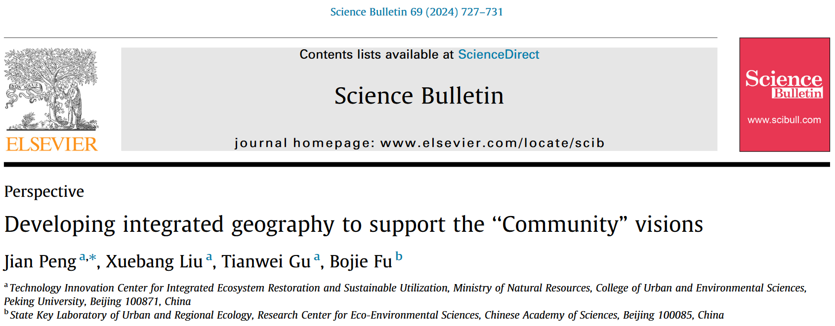 Peng J, Liu X, Gu T, Fu B. Developing Integrated Geography to Support the “Community” Visions. Science Bulletin, 2024, 69:727-731.