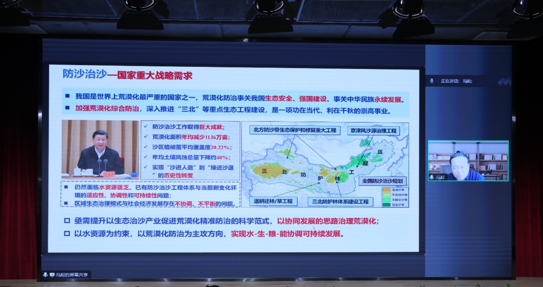 冯起院士以“中国防沙治沙技术及国际意义”为题,立足防沙治沙的国家战略,从荒漠化防治发展历程、荒漠化治理的典型模式,荒漠化治理生态产业、特殊环境下防沙治沙技术以及配套的的工程体系、防风治沙领域国际合作等方面系统性地介绍了我国在防风治沙领域的探索和实践,展示了中国治沙方案在全球环境治理领域中展现的大国担当。