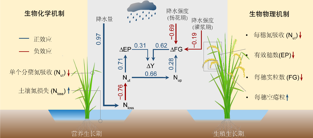 为了揭示极端降水造成水稻减产的机制,研究团队于2018-2019年在荆州农业气象试验站开展了64场降水控制试验。结果表明,极端降水主要通过改变实粒数(71-75%)和有效穗数(22-25%)而造成水稻减产;这种影响具有生育期依赖性,即营养生长期的极端降水主要降低有效穗数,生殖生长期的极端降水主要降低实粒数(图1)。为了进一步识别和验证关键的影响机制,研究团队于2021年开展了两类补充试验(即扬花期降水半遮挡、营养生长期降水后补肥),证实了生殖生长期降水强度降低顶粒受精而影响实粒数,以及营养生长期降水量增加稻田氮损失和减少叶片氮吸收而影响有效穗数是最关键的两个影响机制(图2)。