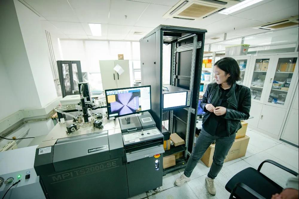 硅晶圆上蚀刻出来的触点和线路,在显微镜下如同城市的鸟瞰图。身穿皮衣和牛仔裤的黄芊芊研究员,和两位学生一起站在测试台前。如果不事先介绍,你不一定能一眼认出谁是导师。他们将晶圆上需要测试的区域停在显微镜的下方,操纵探针轻轻抵住触点,开始对晶体管进行加电测试。半导体参数分析仪的显示屏上很快出现了一条漂亮的电流曲线,说明测试对象的性能良好。