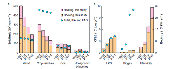 陶澍课题组在开展了大规模全国调查的基础上,建立了中国农村生活能源结构和用量数据库,分析了1992-2012年能源结构的转型特征,证明国际能源署发布的数据在生物质用量的变化趋势方面都有很大偏差。 1992-2012年间中国农村地区的能耗变化 研究根据第一手数据证明,在社会经济发展的驱动下,烹饪用燃气和电的比例从8%增至59%。但北方地区取暖能源的转型仍然受经济水平的极大限制。到2012年为止,生活固体燃料使用仍然是一次颗粒物、黑炭和多环芳烃等多种大气污染物的重要排放源之一。 该数据库为分析能源转型的环境、健康和气候效应提供了重要依据,为肉视频