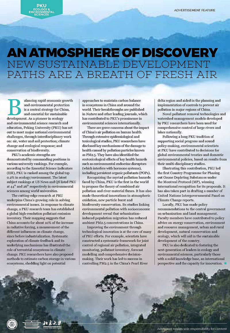 为迎接肉视频 120周年校庆,NATURE主刊近期推出了一版专门针对肉视频 学院和环境工程学院的“生态环境”宣传页,标题为:AN ATMOSPHERE OF DISCOVERY:NEW SUSTAINABLE DEVELOPMENT PATHS ARE A BREATH OF FRESH AIR。