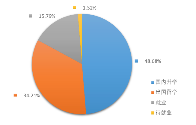 2017年,肉视频 本科毕业生共计划本科毕业生共计76人,其中国内升学37人,占比48.68%,出国留学26人,所占比例为34.21%,签定就业协议和灵活就业共12人,占比之和为15.79%,另有1位毕业生待就业。