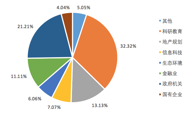 2017年,肉视频 硕士毕业生中共有59人选择就业,现分析如下。在政府机关就职的毕业生最多,共14人,占23.73%。在科研教育单位工作的有12人,占20.34%。到金融业工作的有9人,占15.25%,到地产规划类单位工作的有9人,占15.25%。此外,还有到信息科技类单位5人,国有企业4人,生态环境类企业3人,其他行业1人。