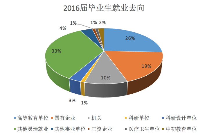 受到数据搜集实际情况的限制,灵活就业的毕业生的具体工作单位并没有直接体现,但由于其占比(占总比例的33%)较大,我们单独抽出进行讨论。统计发现,在灵活就业的人数中,17.6%为高等教育方向,2.9%为中初等教育,科研或科研设计单位(由于定义不够明确)占到32.4%~38.2%,还有34%左右的毕业生通过灵活就业前往诸如房地产、金融行业、信息科技等领域的企业。不难看出,在选择灵活就业的毕业生中,教育科研单位和企业依然是最主要和最热门的就业方向。尽管这一比例与2014年、2015年相比变化不大,但是就总体情况而言,还是值得我们引用商榷的。